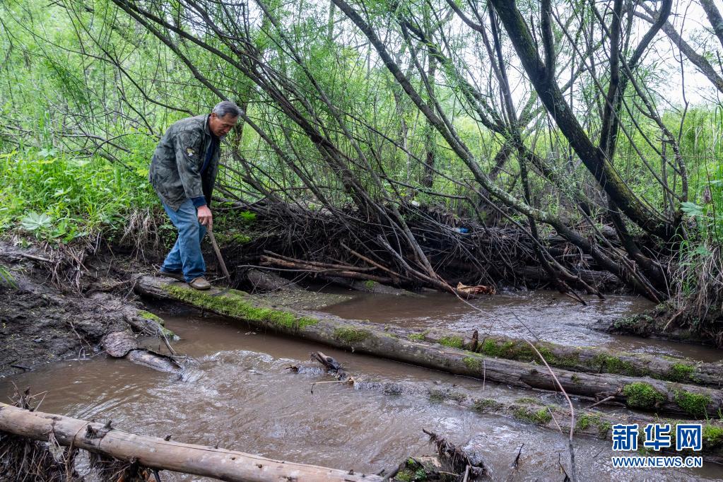 6月3日,在黑龙江省伊春市乌马河林业局有限公司乌马河林场分公司施业区,张英善巡山时通过一条小河。新华社记者 谢剑飞 摄