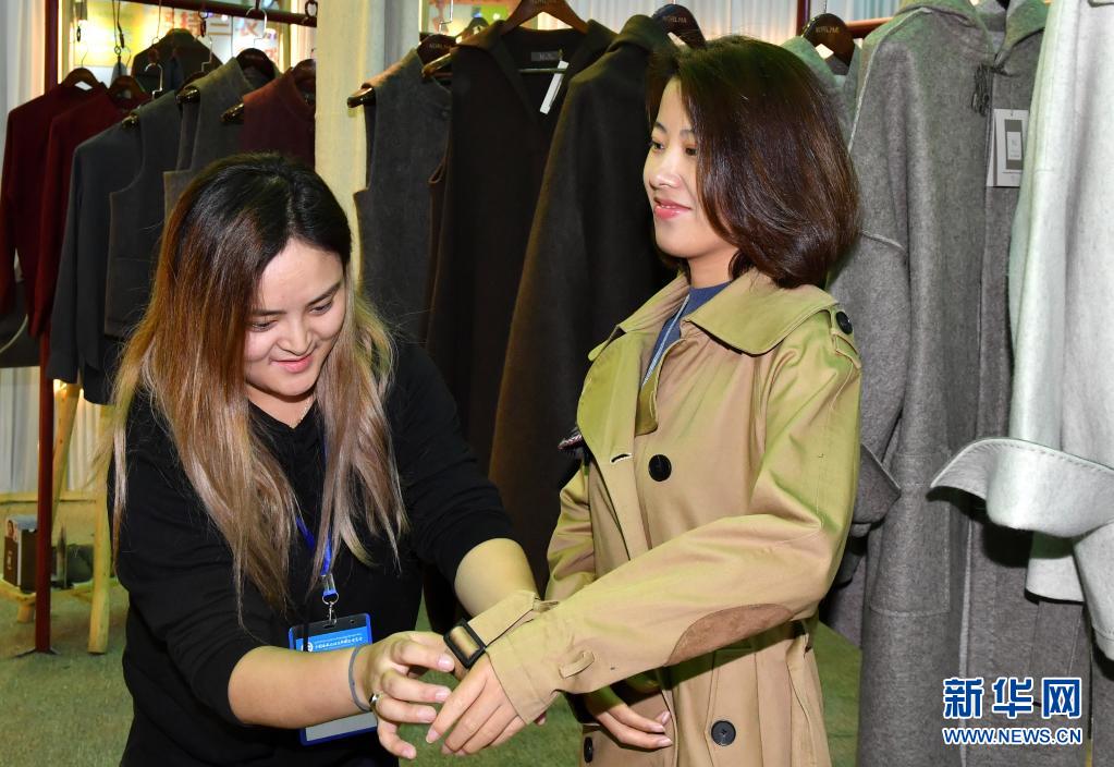 顾客在藏博会上试穿当地产的服装(2018年9月8日摄)。