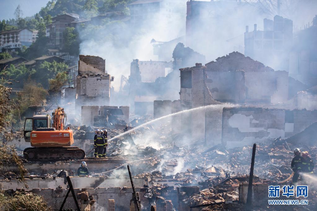 重庆江津区中山古镇明火已被基本扑灭,救援人员仍在清理火场(6月4日摄)。