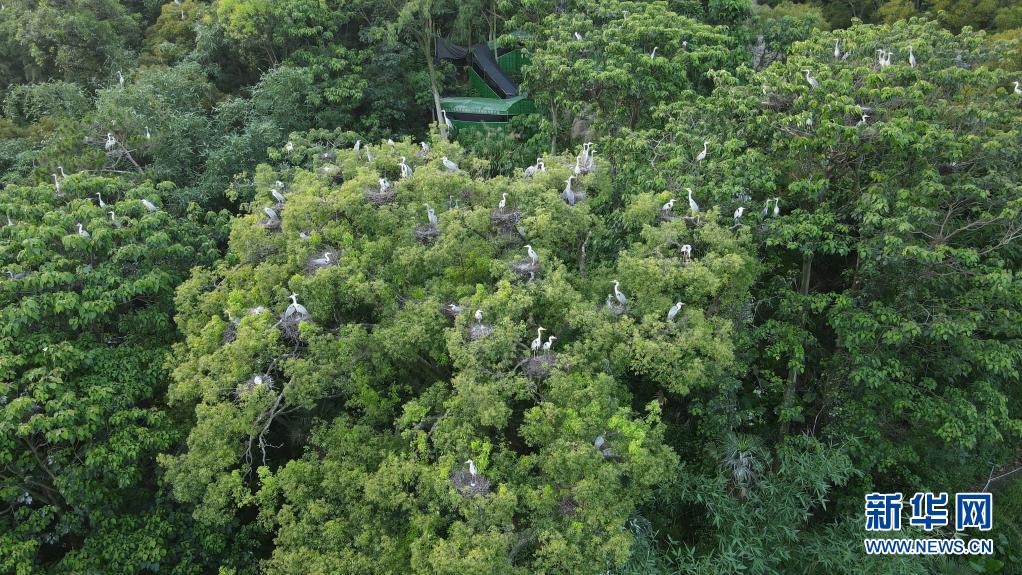 这是罗源县碧里乡濂澳村后山茂密的树林,成群的苍鹭在树上筑巢栖息(6月3日摄,无人机照片)。