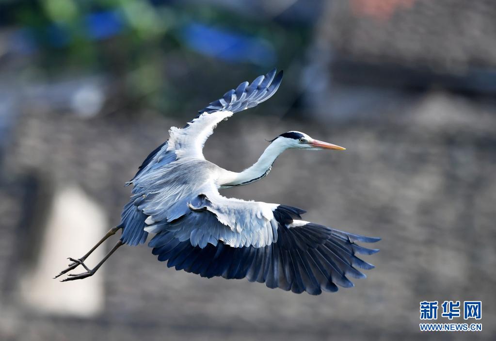 一只苍鹭在濂澳村上空展翅飞翔(6月3日摄)。