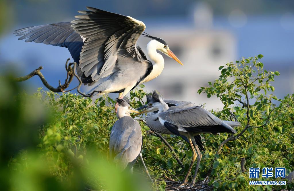 在树上筑巢栖息的苍鹭(6月3日摄)。