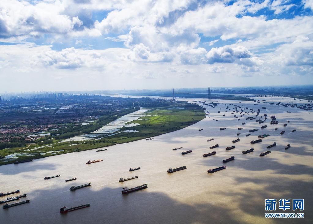 船舶在湖北省武汉市阳逻港区水域行驶(2018年8月13日摄,无人机照片)。新华社记者 肖艺九 摄