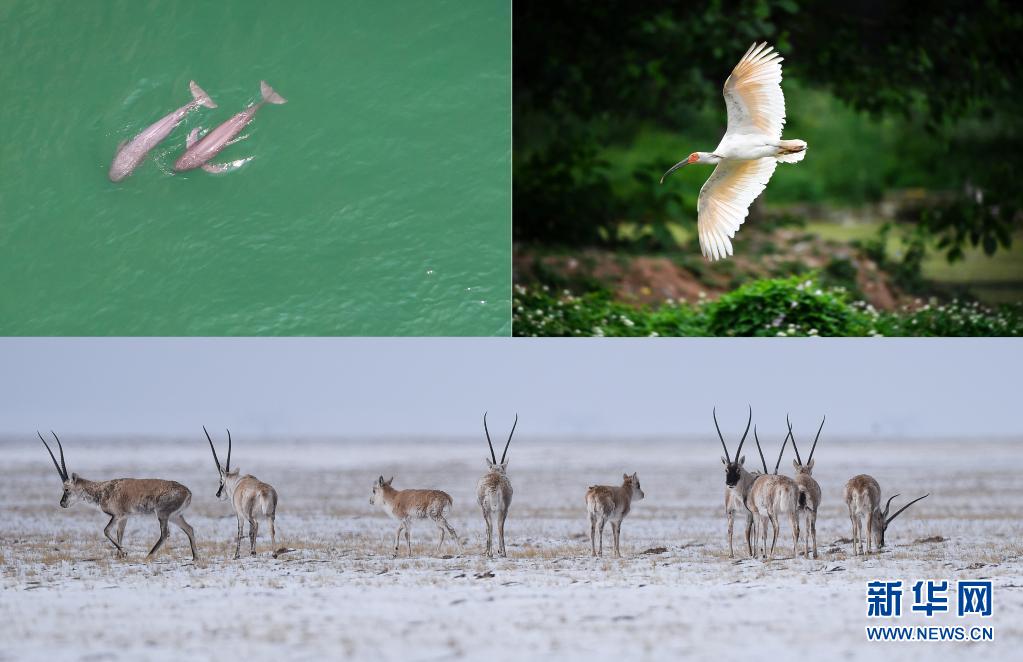 这是一张拼版照片:左上图为在湖北省宜昌市江边,长江江豚在水中嬉戏(无人机照片,新华社记者肖艺九5月11日摄);右上图为陕西省汉中市洋县朱鹮生态园内的朱鹮(新华社记者刘潇5月13日摄);下图为藏羚羊在三江源可可西里地区活动(新华社记者吴刚4月20日摄)。新华社发