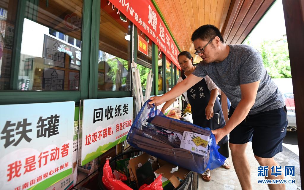 2020年8月25日,居民将生活垃圾送到海口市美兰区和平南街道爱心环保屋,用垃圾换取纸巾、肥皂等生活用品。新华社记者郭程摄