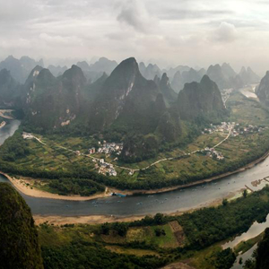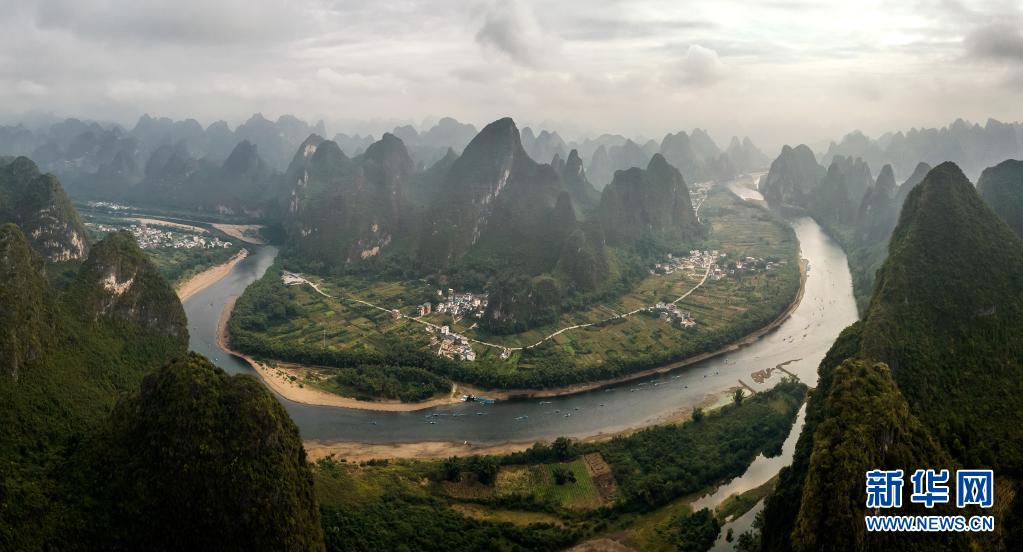 这是2018年10月18日拍摄的广西桂林阳朔县兴坪镇的漓江景色(无人机拼接照片)。新华社记者 李鑫 摄