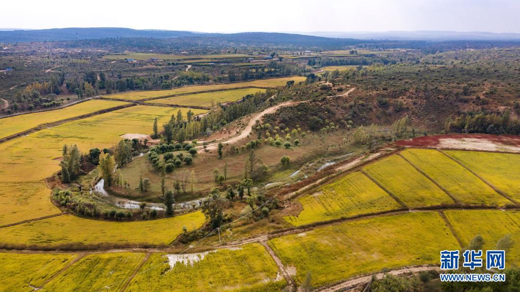2020年9月26日拍摄的陕西省靖边县黄蒿界镇马季沟村稻田(无人机照片)。近年来,靖边县实施了“三北”防护林、退耕还林、流域治理等生态建设工程,北部沙漠区裸露明沙完全消失,中部农田林网蔚然成荫,南部山区夏季绿色满山。新华社记者 陶明 摄