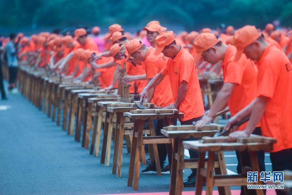 6月5日,数千名红木产业工匠在红木文化节开幕式上,用手中的雕花刀、刮磨刀、木槌等工具,展示传统红木家具的榫卯、刮磨和雕刻工艺。