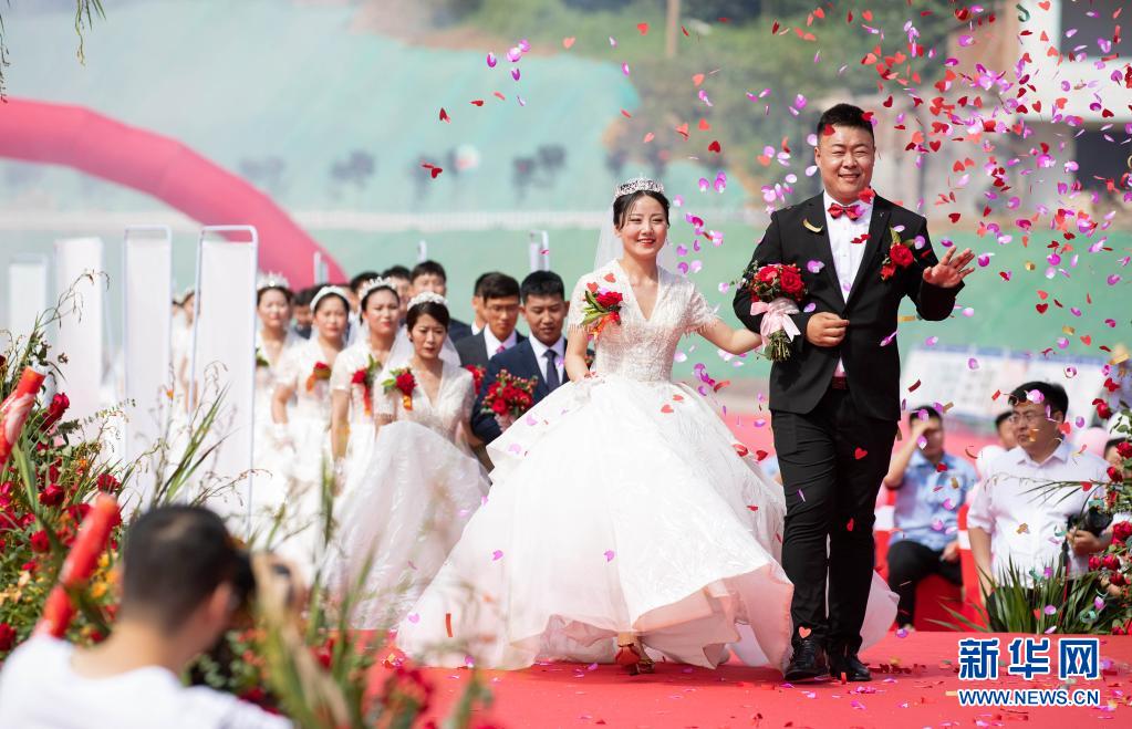 当日,来自中铁三局五公司各建设工地的17对新人在宜彝高速公路(四川宜宾至云南彝良)高县文江互通施工现场,以山水为证,身着盛装踏上红地毯,携手步入婚姻殿堂。