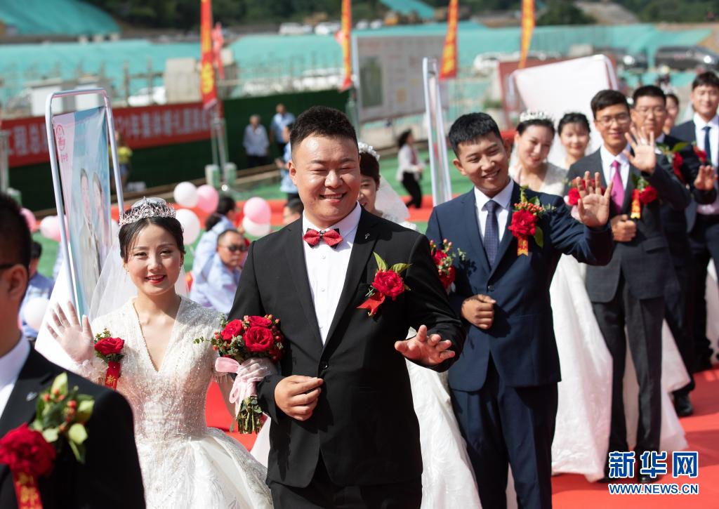 6月5日,在宜彝高速公路高县文江互通施工现场,新人参加集体婚礼。新华社记者 江宏景 摄