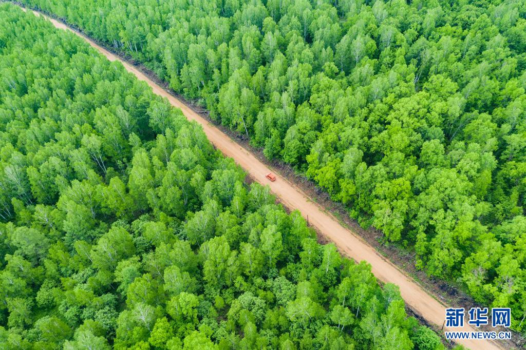 6月4日,刘宏伟驾车进行森林巡护(无人机照片)。新华社记者 谢剑飞 摄