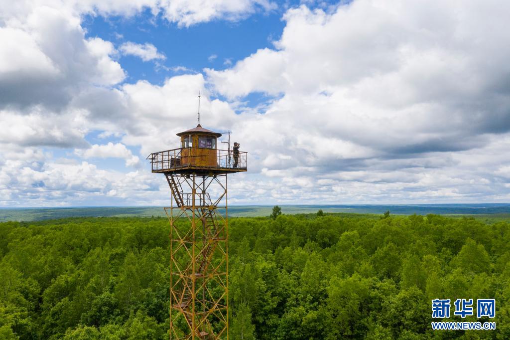 6月4日,刘宏伟在防火瞭望塔瞭望(无人机照片)。新华社记者 谢剑飞 摄