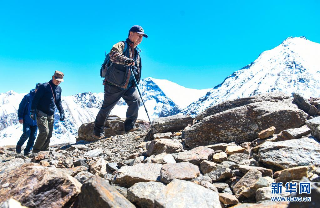 李维东(右一)和志愿者在乌鲁木齐天山一号冰川附近,准备登上山体观测伊犁鼠兔活动踪迹(5月25日摄)。新华社记者 王菲 摄