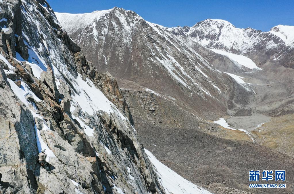 李维东(图中左下)在乌鲁木齐天山一号冰川附近的崖壁上观测伊犁鼠兔活动踪迹(5月25日摄,无人机照片)。新华社记者 宿传义 摄