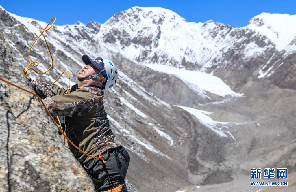 李维东在乌鲁木齐天山一号冰川附近的崖壁上观测伊犁鼠兔活动踪迹(5月25日摄)。新华社记者 王菲 摄
