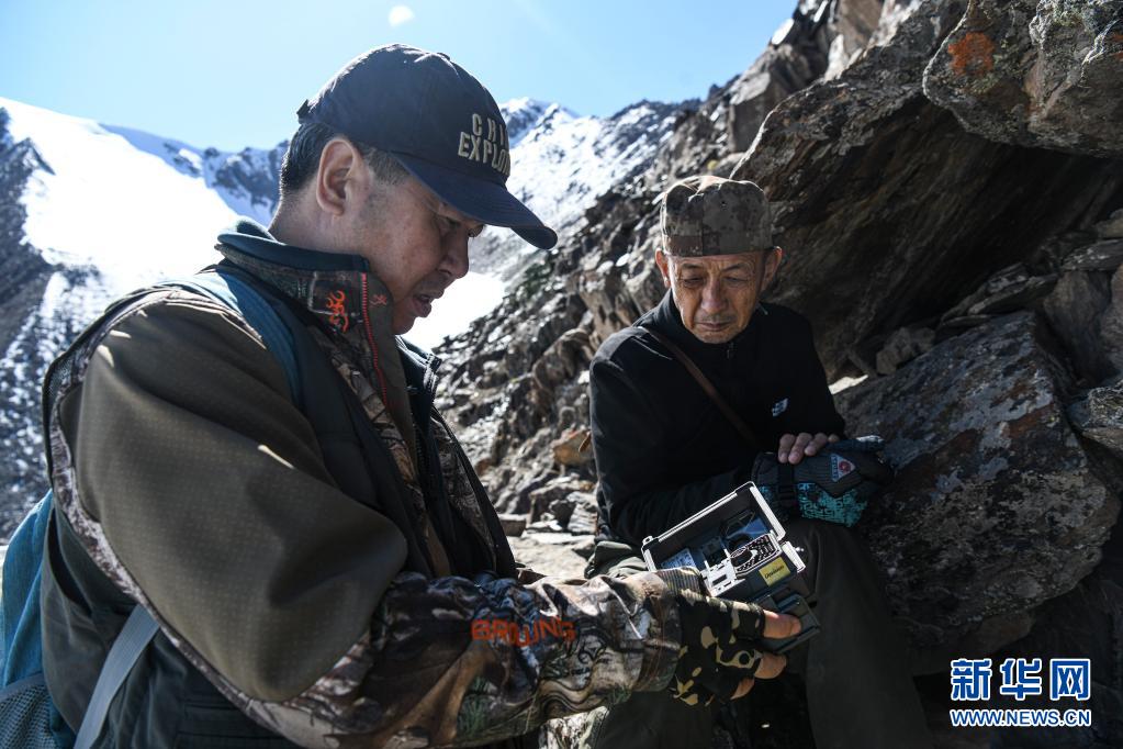 李维东(左)和志愿者马春晖在乌鲁木齐天山一号冰川附近的山体上,准备更换远红外摄像机的电池和存储卡(5月25日摄)。新华社记者 王菲 摄