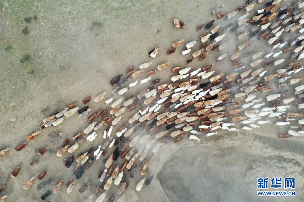 6月5日,在新疆阿勒泰地区福海县沙尔布拉克春秋牧场的牧道上,牲畜向夏季牧场迁徙(无人机照片)。新华社记者 沙达提 摄