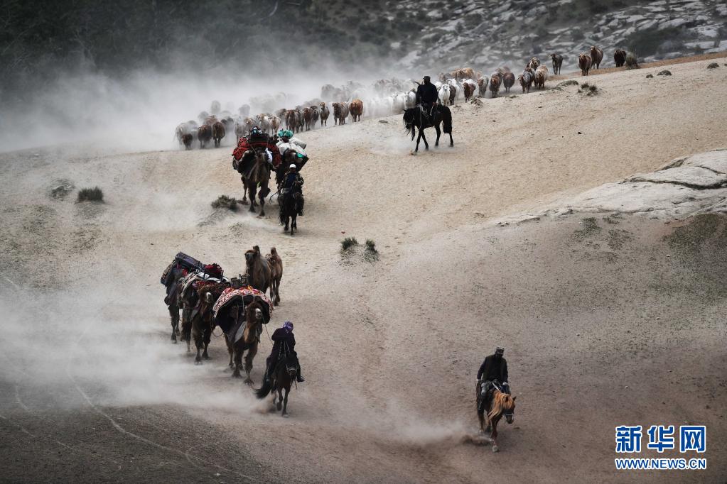 6月5日,在新疆阿勒泰地区福海县沙尔布拉克春秋牧场的牧道上,牧民带着驼队,引着牲畜向夏季牧场迁徙。新华社记者 沙达提 摄