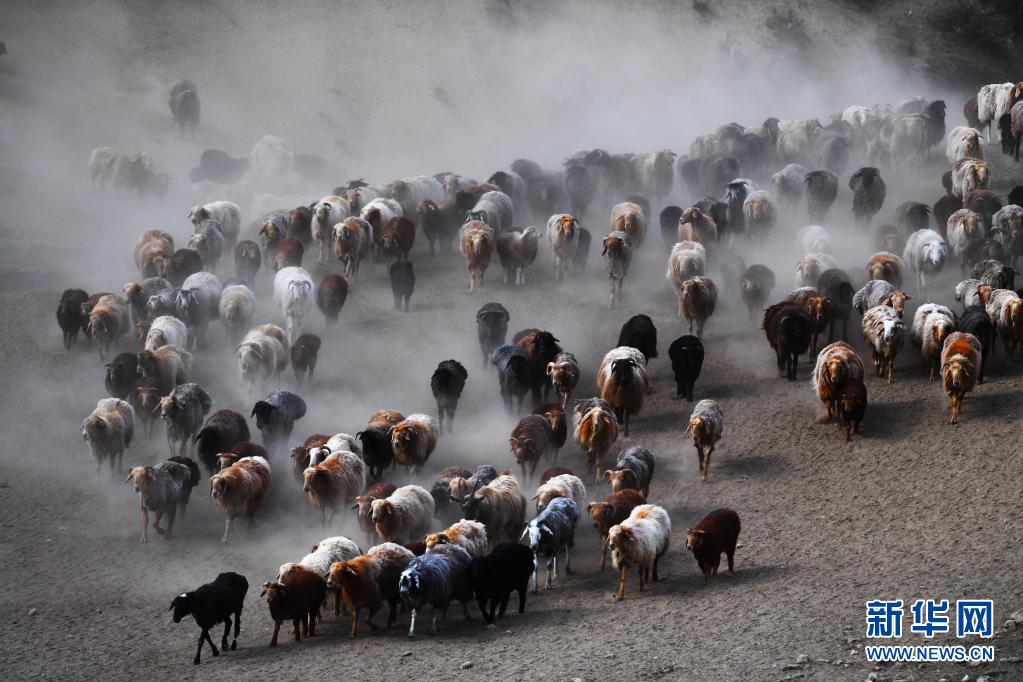 6月5日,在新疆阿勒泰地区福海县沙尔布拉克春秋牧场的牧道上,牲畜向夏季牧场迁徙。新华社记者 沙达提 摄