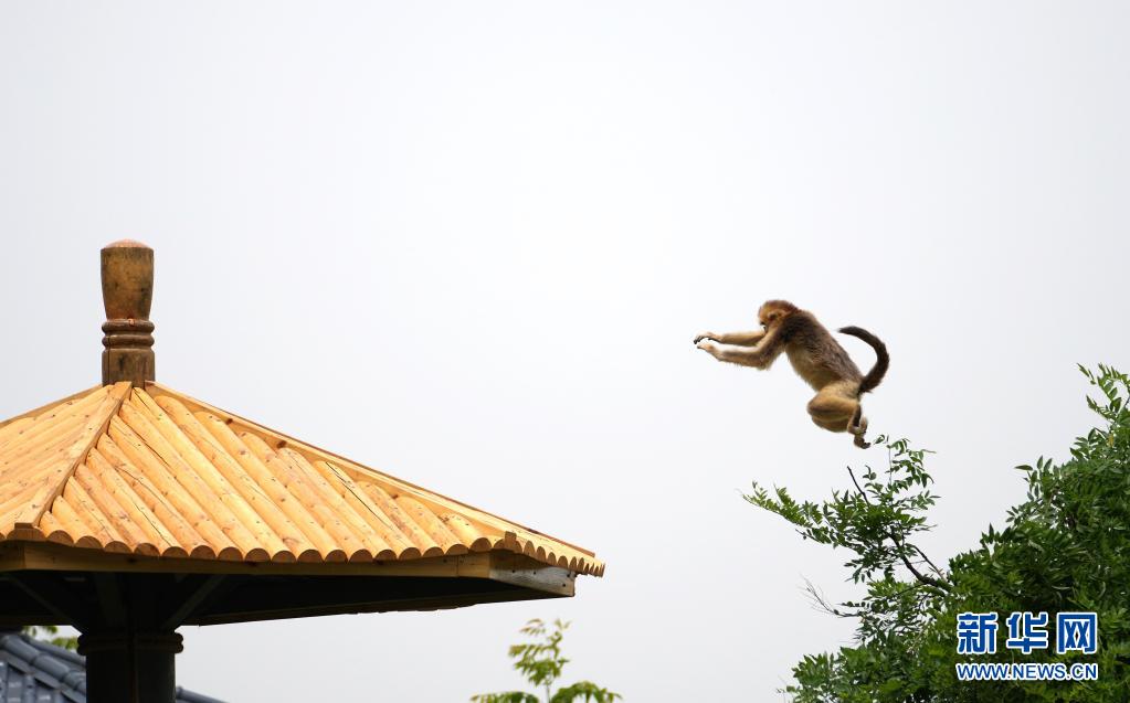 5月28日,金丝猴在秦岭四宝科学公园内玩耍。