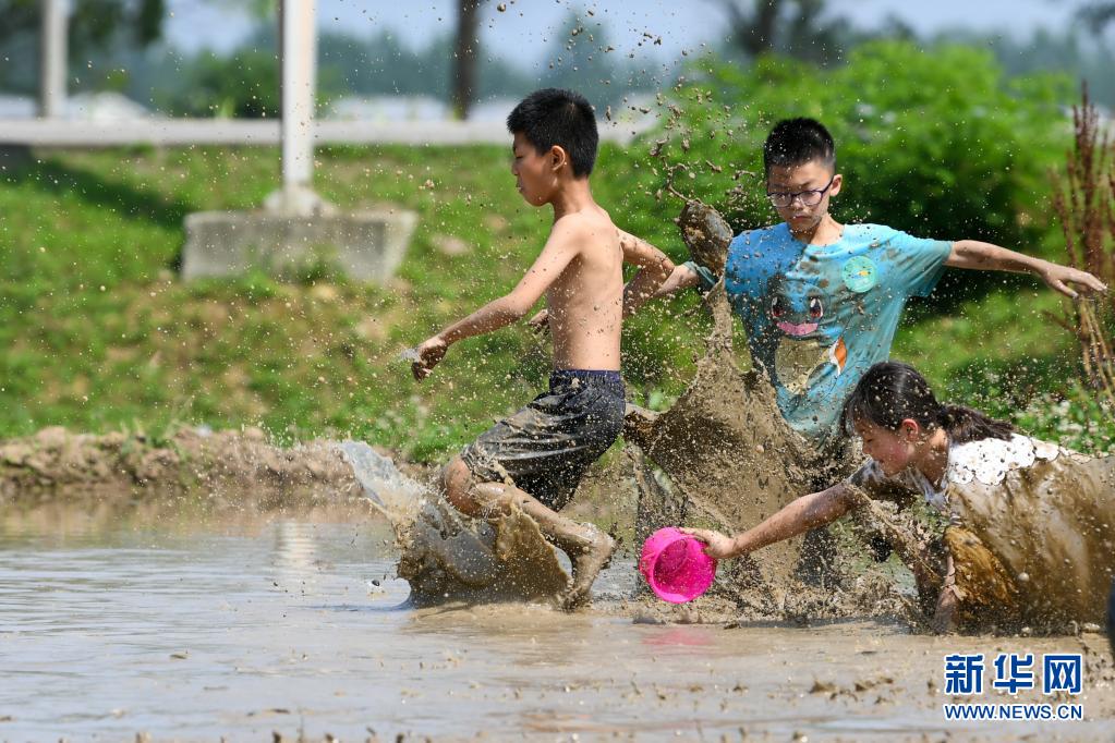 6月1日,小朋友在四川省成都市崇州市道明镇竹艺村体验捉鱼。