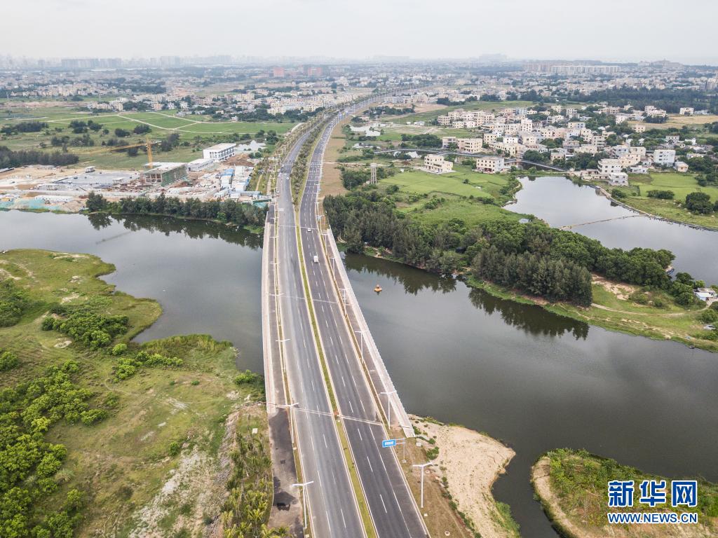 这是6月4日在海口江东新区拍摄的迈雅河大桥(无人机照片)。