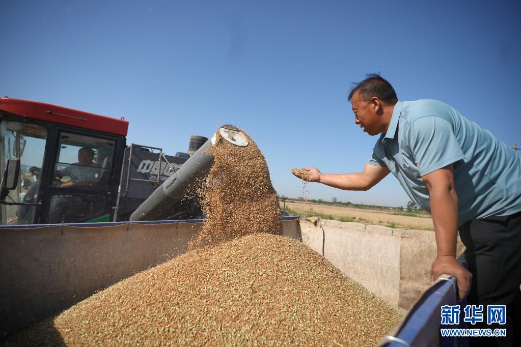 6月6日,河北邢台经济开发区南阳二村村民查看刚收获的小麦。