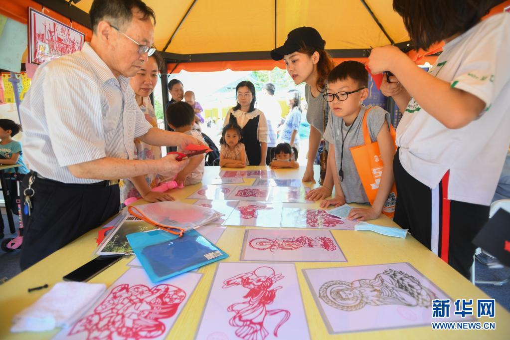 6月6日,在长沙市非遗宣传展示活动现场,市民在观赏剪纸技艺。