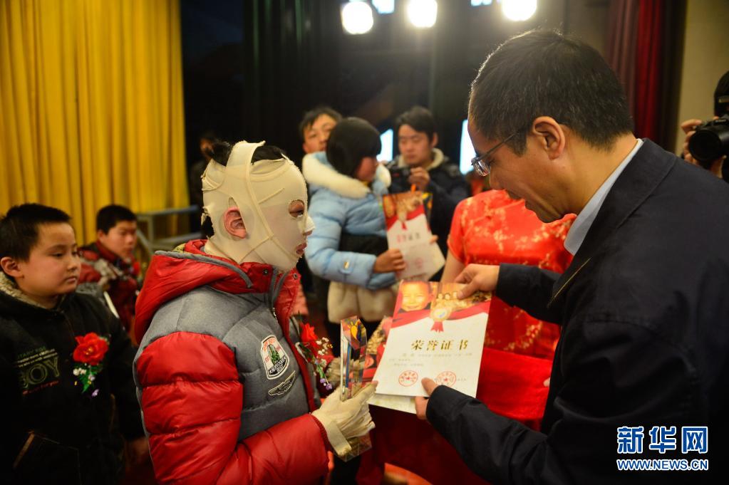 因面对不幸时表现出的勇敢和自强不息,周涛获得江西省“三友”自强少年称号(2015年1月11日摄)。新华社记者 周密 摄