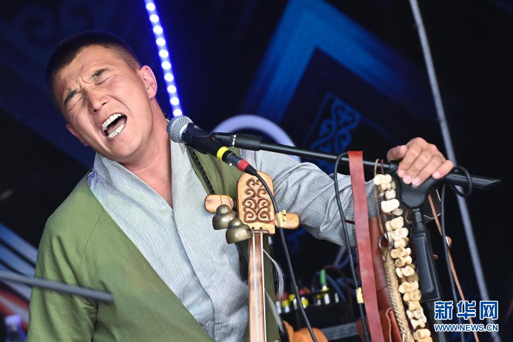 演出时,那拉提乐队成员加那尔别克·阿黑哈提引吭高歌(6月3日摄)。新华社记者 丁磊 摄