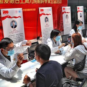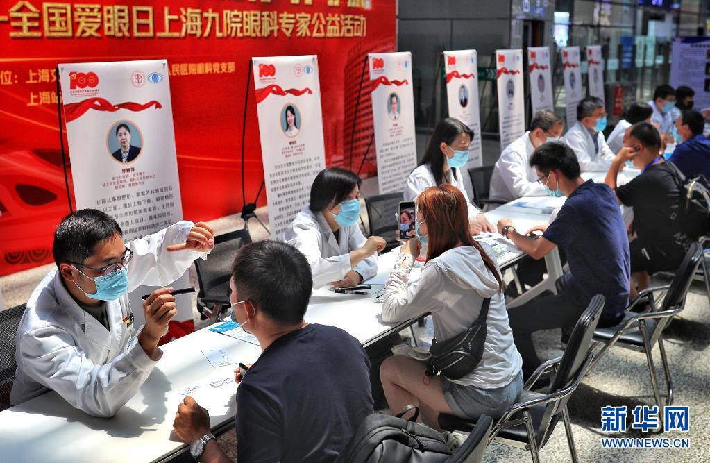 6月6日,医务人员在上海虹桥火车站候车大厅为旅客检查眼睛。