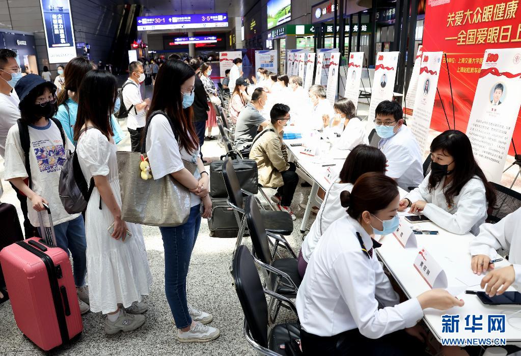 当日是第26个全国爱眼日。上海交通大学医学院附属第九人民医院眼科党支部与上海虹桥火车站党总支在上海虹桥火车站联合开展科普宣讲及义诊活动,眼科医疗专家现场为旅客提供义诊、眼部检查和眼健康科学知识宣讲等服务。
