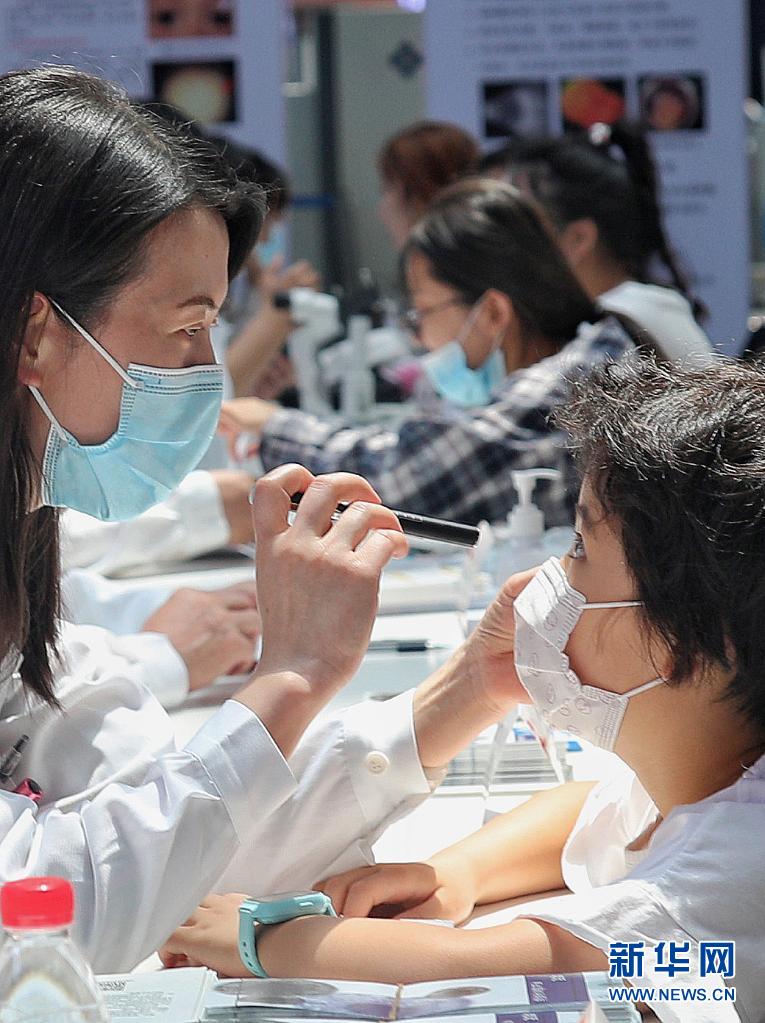 6月6日,医务人员在上海虹桥火车站候车大厅为旅客检查眼睛。