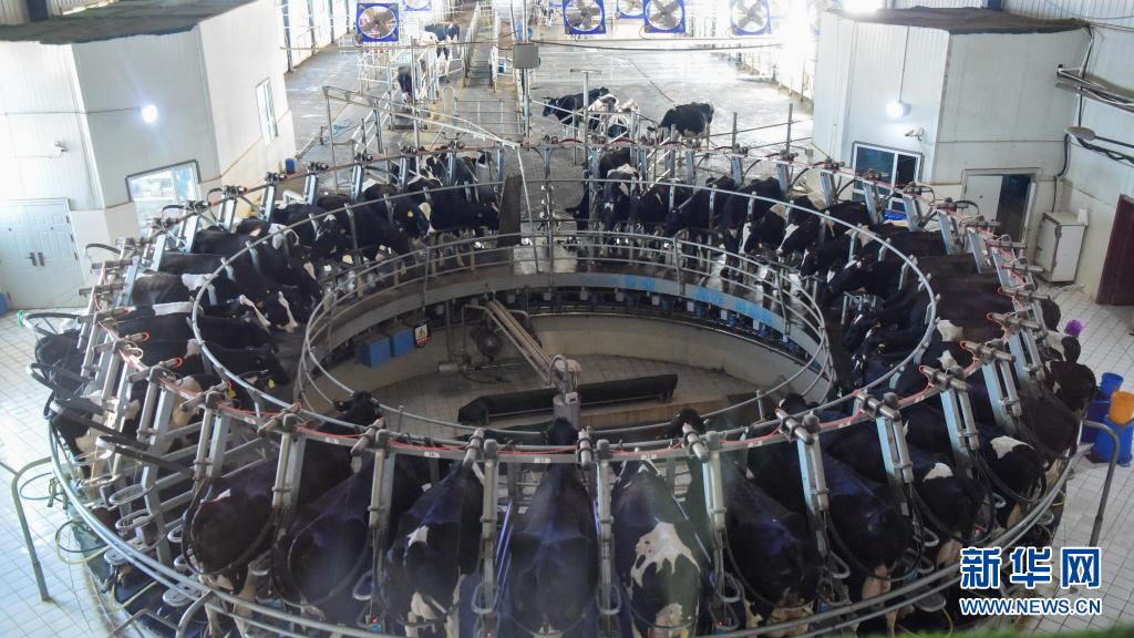 这是在新疆天润乳业股份有限公司丝路云端牧场拍摄的智能转盘式挤奶厅(2020年5月26日摄)。