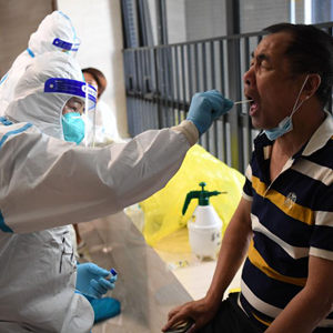 6月6日,在被列为高风险地区的广州荔湾区白鹤洞街道某小区,检测小组医务人员上门为住户进行核酸检测采样。新华社记者 邓华 摄