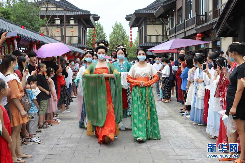 汉服爱好者在河南省修武县云台古镇表演(2020年8月15日摄)。新华社发(修武县委宣传部供图)