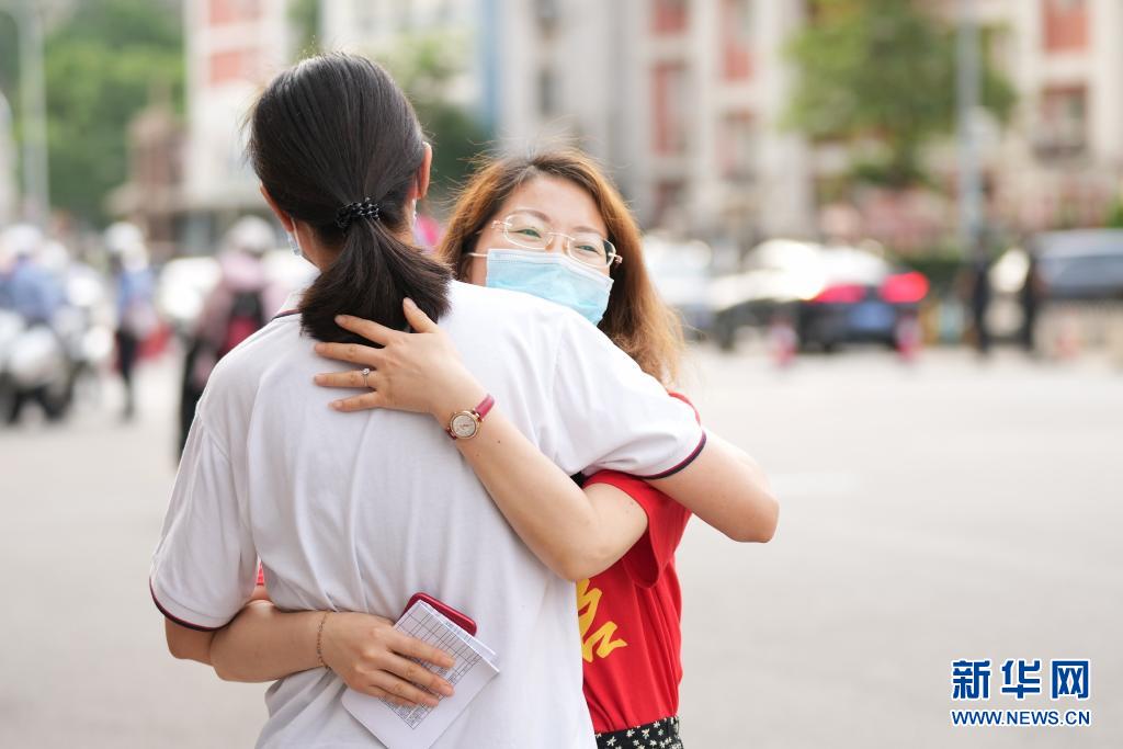 6月7日,在北京市陈经纶中学考点,一位考生(前)与老师拥抱。