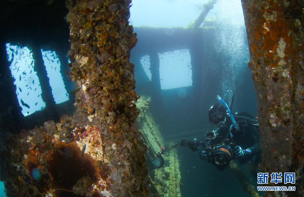 摄影师在蜈支洲岛海域海洋牧场的沉船鱼礁内拍摄(5月21日摄)。