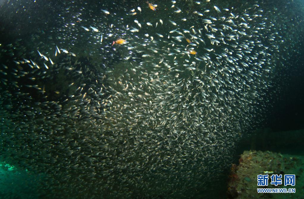 这是蜈支洲岛海域海洋牧场沉船鱼礁内的鱼群(5月21日摄)。