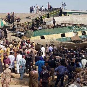 这是6月7日在巴基斯坦信德省拍摄的火车相撞事故现场(手机拍摄)。