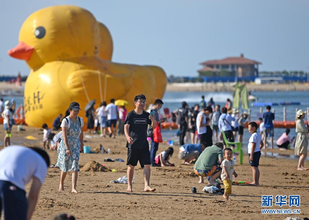 游人在天津市滨海新区东疆港人工沙滩游玩(6月5日摄)。新华社记者 李然 摄