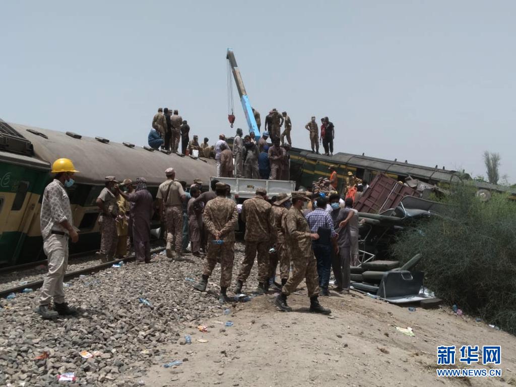 6月7日,安全人员在巴基斯坦信德省科德吉地区查看倾覆的车厢(手机拍摄)。