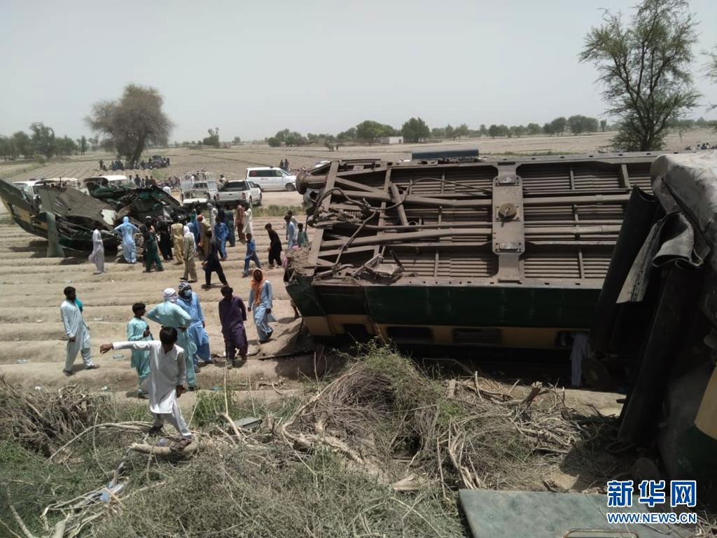 6月7日,人们聚集在巴基斯坦信德省科德吉地区的列车相撞事故现场(手机拍摄)。
