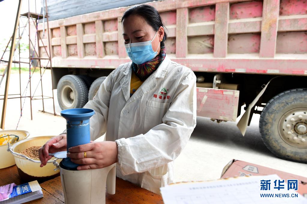 6月7日,在安徽省农垦集团龙亢农场良种生产厂,工作人员对收割的小麦进行质量检测。