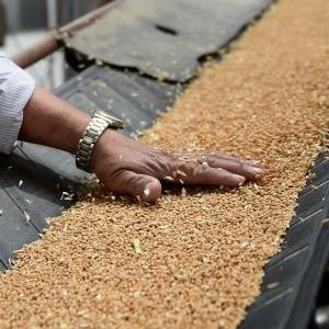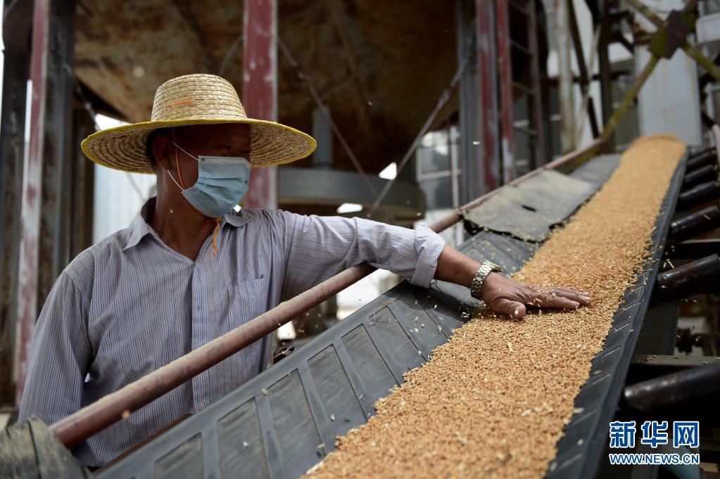6月7日,在安徽省农垦集团龙亢农场良种生产厂,工作人员将收获的小麦入库存放。