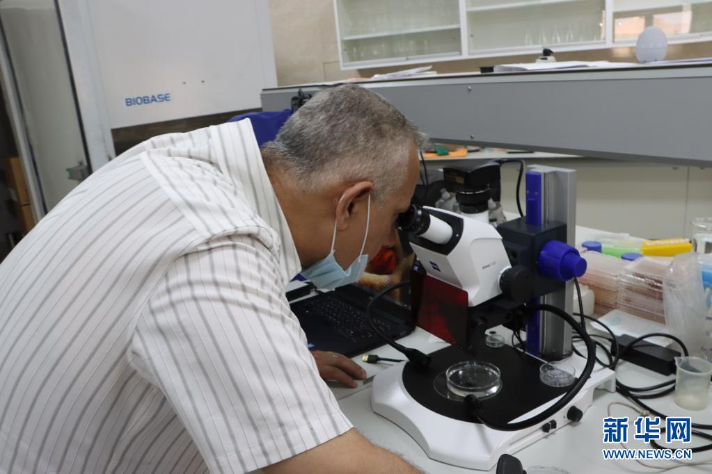 5月20日,约旦珊瑚研究专家福阿德·胡拉尼在位于约旦亚喀巴海洋科学站内的实验室观测珊瑚幼虫。