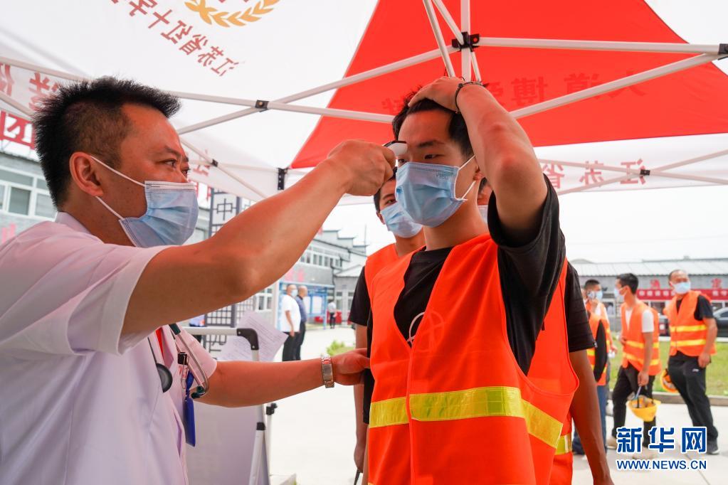 6月8日,在中铁四局江苏南沿江城际铁路站前1标段施工项目驻地,工人在排队区测量体温,准备接种疫苗。