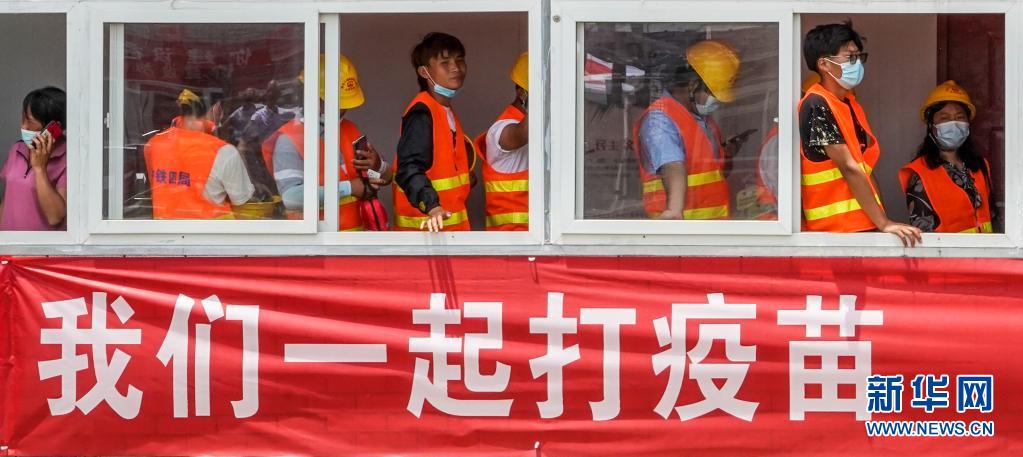 6月8日,在中铁四局江苏南沿江城际铁路站前1标段施工项目驻地,工人们在排队区内排队,准备接种新冠疫苗。