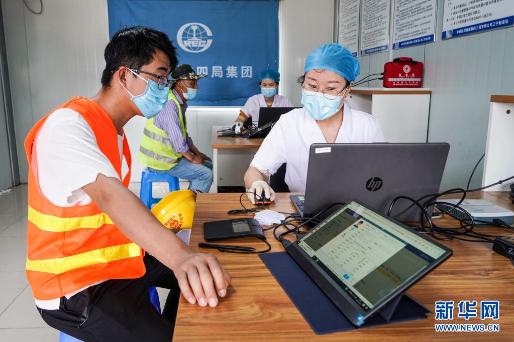 6月8日,在中铁四局江苏南沿江城际铁路站前1标段施工项目驻地,工人们在登记区登记个人信息,准备接种疫苗。