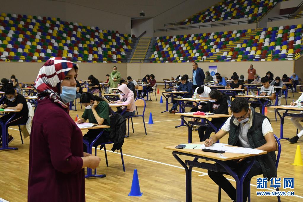 6月8日,戴着口罩的学生在摩洛哥拉巴特参加大学入学考试。新华社发(查迪 摄)
